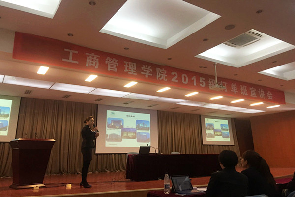 3月29日下午,在我校图书馆报告厅举行了工商管理学院2015级学生订单班实习宣讲会。参加此次宣讲会的有京东( 宿迁 )、乌镇旅游股份有限公司、上海统一星巴克、苏州吴江海悦花园酒店、优速快递物流有限公司、江苏中广置业有限公司等17家与我校签订订单班的企业和我校工商管理学院2015级近500名学生。