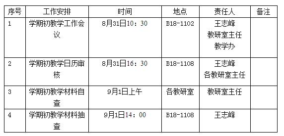 1、8月31日上午10:30在B18-1102室召开本学期学期初教学工作会议,安排教学检查相关工作,要求各教研室主任必须参加。