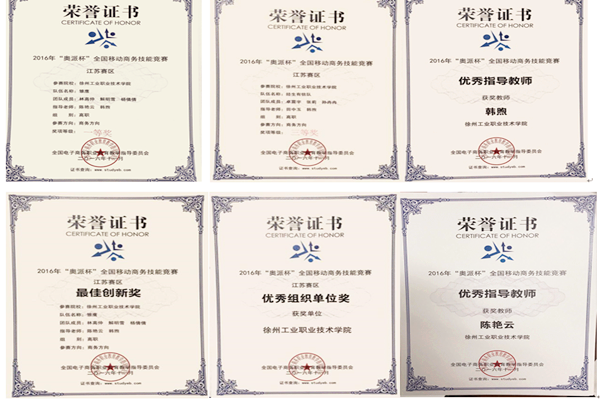 2016年10月29日,由全国电子商务职业教育委员会主办的2016 “奥派杯”全国移动商务技能竞赛江苏省省赛在南京落下帷幕。我校工商管理学院由田中玉、韩煦、陈艳云等老师指导的“雏鹰队”和“经生有信队”在本次大赛中获得省级团体一等奖和三等奖的好成绩。“雏鹰队”获得最佳创新单项奖,我校获得优秀组织单位奖,陈艳云老师和韩煦老师分别获得优秀指导老师奖。