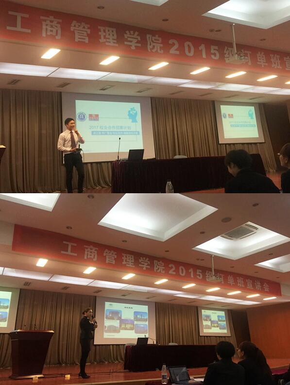 3月29日下午,在我校图书馆报告厅举行了工商管理学院2015级学生订单班实习宣讲会。参加此次宣讲会的有京东( 宿迁 )、乌镇旅游股份有限公司、上海统一星巴克、苏州吴江海悦花园酒店、优速快递物流有限公司、江苏中广置业有限公司等17家与我校签订订单班的企业和我校工商管理学院2015级近500名学生。