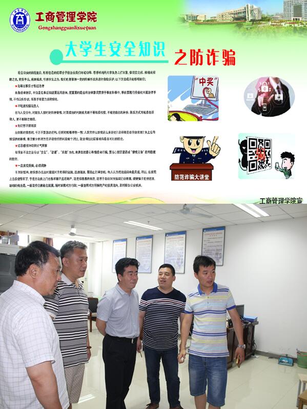 为确保活动顺利开展进行,学院成立了“安全生产月”工作领导小组,组长由罗军书记、张恒中院长担任。在B18楼醒目位置悬挂活动主题相关的条幅,制作关于防灾、防诈骗、防火知识的宣传展板。同时,自6月1日起各班利用晚自习时间组织观看各类安全教育警示片。针对学生安全问题的重中之重,我院印发《大学生宿舍安全知识之用电防火》宣传页,发放到各个宿舍。通过以上活动,不仅营造了良好的氛围,更重要的是让同学们学习了安全知识,使同学们在遇到紧急状况时能沉着冷静应对。