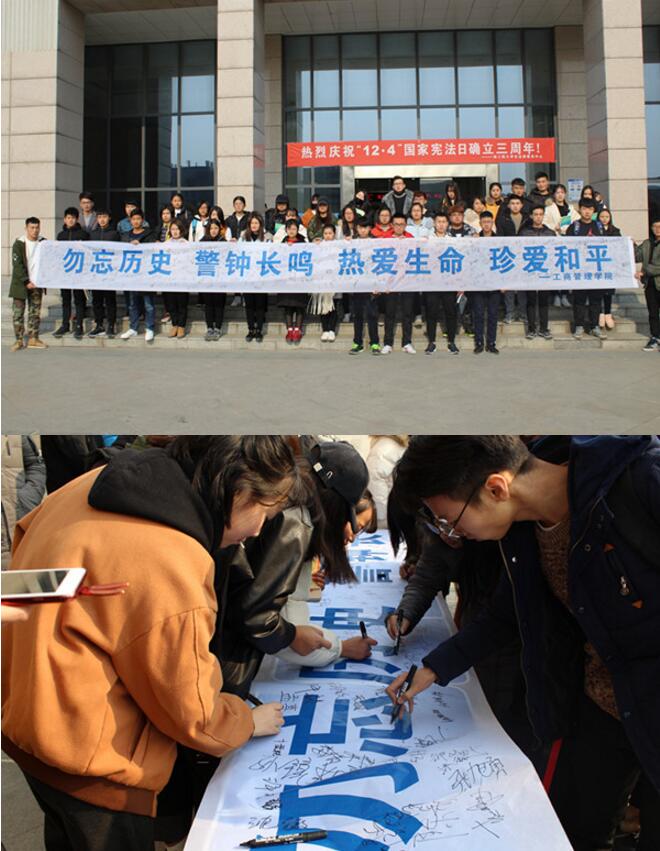 13日中午,数十名学生在B18楼前集合,在撰写着“勿忘历史、警钟长鸣,热爱生命、珍爱和平”的条幅上郑重的签下自己的名字,同学们纷纷表示会不忘历史,牢记使命,为维护国家和平而努力奋斗。13日下午,由商业实战协会的社团成员们开展的“和平千纸鹤 祭奠英烈魂”活动在操场举行,同学们拿出前一天晚上叠好的千纸鹤,念出“和平宣言”,以此祭奠英烈。13日晚上,学院全体2017级学生在晚自习教室内观看了南京大屠杀的影像资料。 80年前,侵华日军侵入南京,制造了惨绝人寰的南京大屠杀惨案,30万同胞惨遭杀戮,无数家庭支离破碎。80年后的今天,第四个国家公祭日,学院举行国家公祭日纪念系列活动,悼念南京大屠杀遇难同胞,为历史拂尘,帮助同学们了解国家公祭日的历史背景及时代内涵,引导青年学子铭记历史,珍爱和平,奋发有为,为实现中华民族伟大复兴而奋斗。