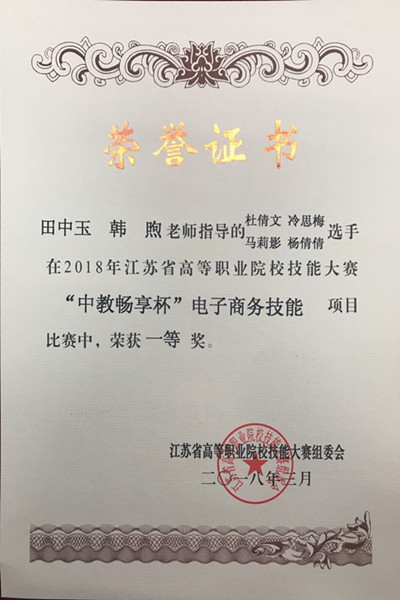3月25日,江苏省高等职业院校技能大赛“中教畅享杯”电子商务技能竞赛在我校拉开帷幕;共有来自全省高职院校56支代表队224名参赛选手参加比赛。我校电子商务专业田中玉、韩煦两位老师指导的杨倩倩、冷思梅、马莉影、杜倩文等4位同学取得团体第三名的优异成绩,荣获一等奖。