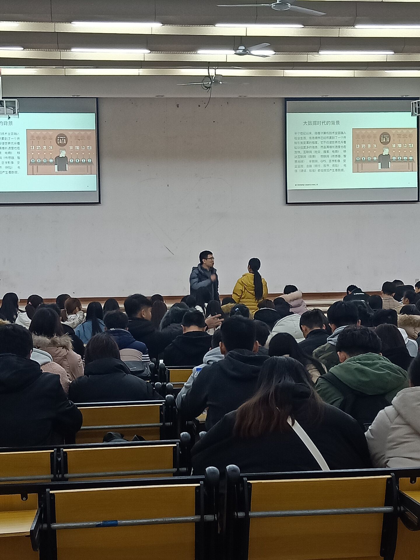雷悦先生以《商务数据分析及应用行业认知》为题,结合日常生活实例,用风趣幽默的语言,围绕大数据产业发展形势、商务数据分析基础知识、商务数据分析人才需求、商务数据分析岗位要求等方面作了深入浅出的讲解,并详细解析了商务数据分析的概念、特征、价值及发展商务数据的优势、面临的挑战。浅显易懂的讲析,让同学们对商务数据分析有了新的认识、新的期待,极大地激发了同学们对商务数据分析的学习兴趣和热情,启蒙了学生训练商务数据分析思维和商务数据分析能力的方法和途径。