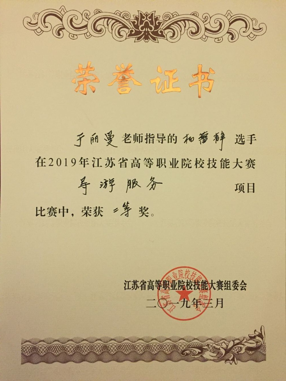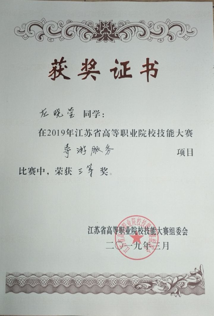 同日,来自我校2016级旅游管理专业的学生左晓莹和杨雷静同学过五关斩六将,在全省50所高职院校95名参赛选手中脱颖而出,获得江苏省高职院校导游服务技能大赛二等奖和三等奖。
