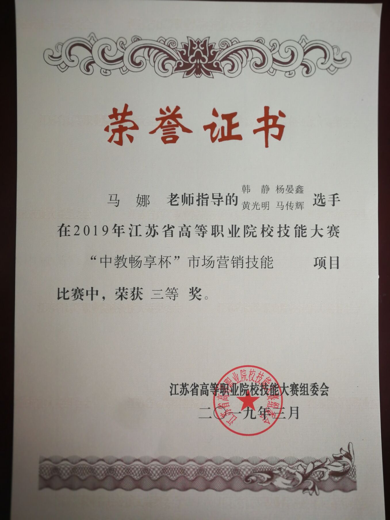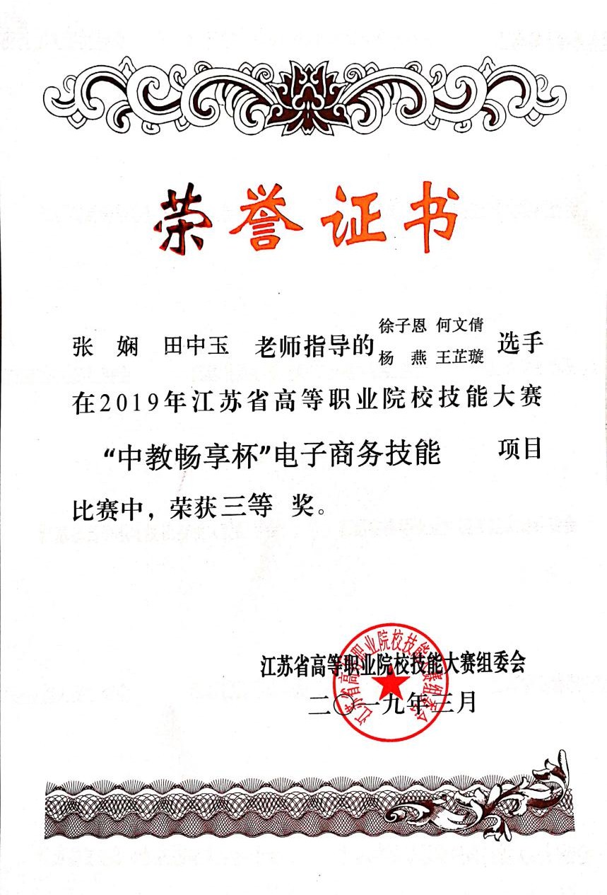 3月10 日,指导教师田中玉、韩煦两位老师指导的2016级电商专业徐子恩、何文倩、杨燕、王芷璇等4位同学参加了“中教畅享杯”2019年江苏省高等职业院校电子商务技能竞赛荣获三等奖,这几位同学从去年4月份开始就利用课余、周末、寒暑假时间刻苦训练,竞赛中以过硬的专业知识和技能、顽强的拼搏精神和良好的心理素质,克服了竞技比赛的种种压力和困难,与来自全省66所高职院校264名高手同台竞技,最终赢得了胜利。