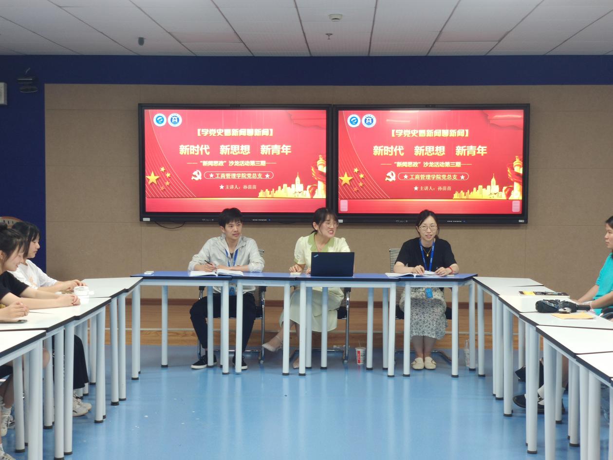 2021年6月12日下午4:00,工商管理学院在B18-508 举行了以《新时代 新思想 新青年》为主题的;新闻+思政沙龙活动第三期暨新思想公开课。本次活动由马克思主义学院孙苗苗老师主持,工商管理学院辅导员及40位学生代表参加。