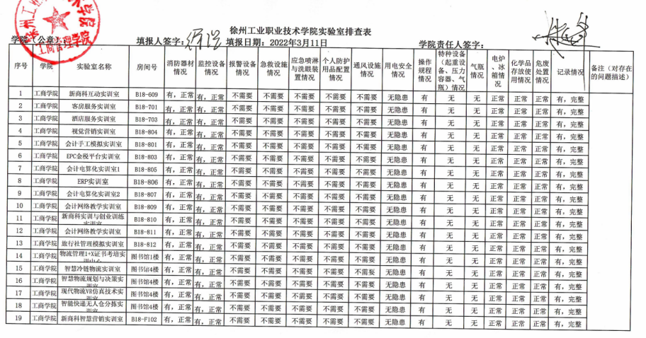 所有参与实训教学的教师必须参加学校组织的实验室安全知识考试,考核不通过者不允许进入实训教学场地。目前所有相关46名教师做到全覆盖参加,100%通过考核。
