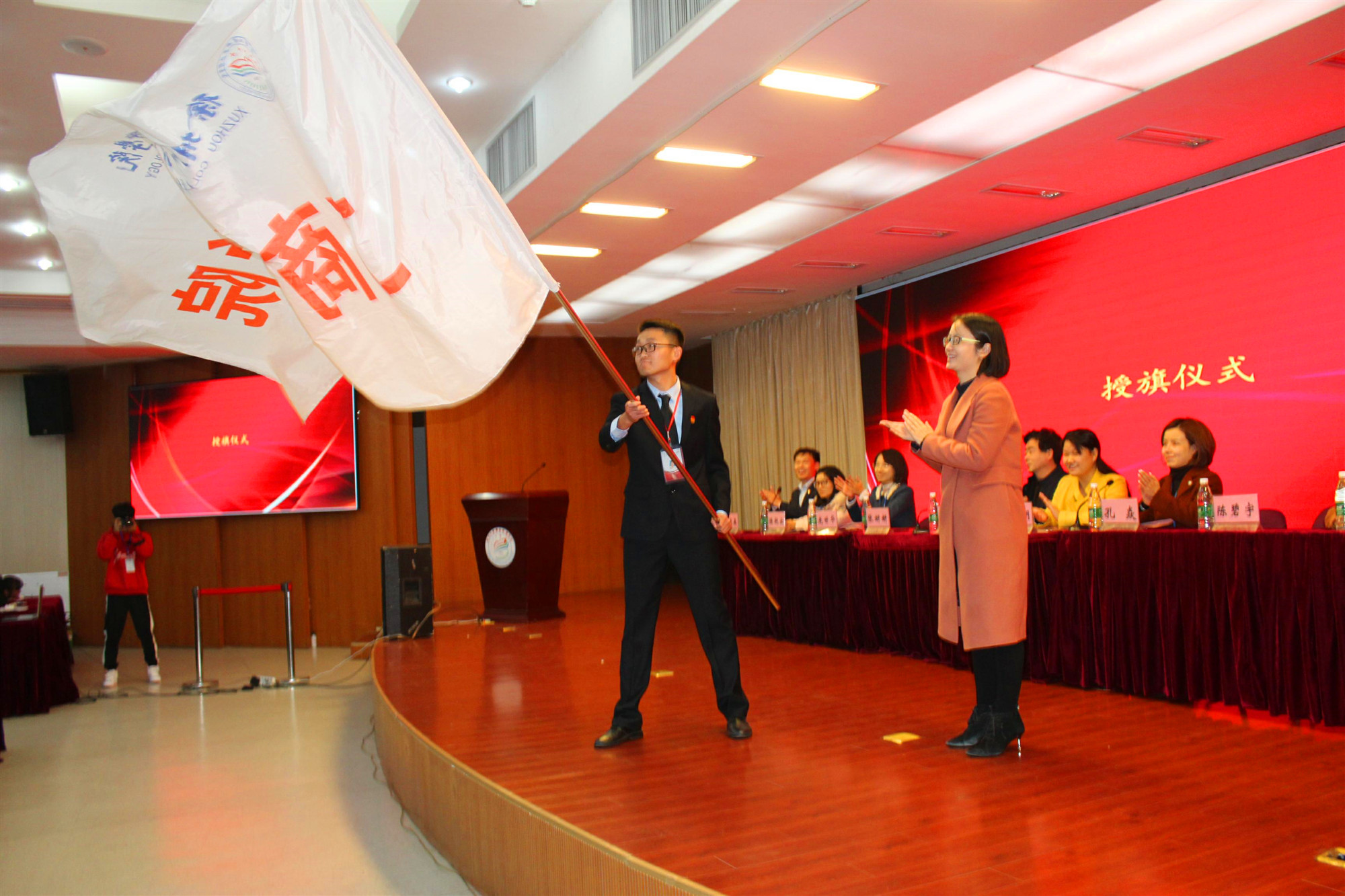 第四届学生会副主席张宝洋代表学生干部带领全体参会学生宣誓。一句句发自肺腑的铿锵誓词表达着他们为学生服务的坚定信心。随后,第四届学生会主席沙晓松郑重地从张妍研书记手中接过工商管理学院学生会会旗,并宣读了本年度学生会工作计划报告。之后,秦黎明副院长宣读了第四期学生骨干能力提升培训班培训计划,希望学生干部通过学习学生干部工作的定位和原则要求、学生干部应具备的素质与能力、办学生活动策划与开展,稿件撰写与宣传等内容,提升自身综合素质,增强团学队伍的凝聚力和战斗力,从而更好做好本职工作,服务学生。